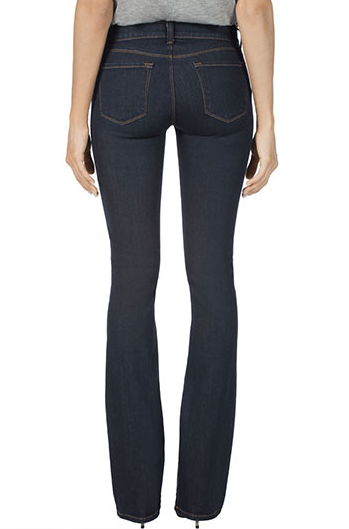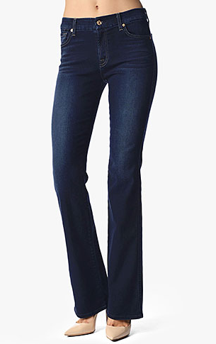 For the curvier woman, a higher rise will tighten up the tummy and elongate your legs. Go for a darker wash such as a solid navy or black. These hues will keep everything streamlined. Look for jeans such as the Kimmie Contour Bootcut from 7 For All Mankind.