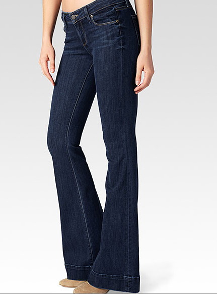 To show off your figure, go for a mid-rise to flatter your smaller waist. A wide legged jean will be the most flattering since it will not only make your legs look slimmer, but create a smooth line from your waist down. A great example is the Fiona Flare by Paige Premium Denim.