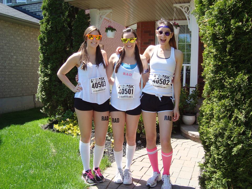 Got dazzled up in our RAD gear. Tattoos and sunglasses were included in our packs. Nicole provided the knee-high socks, I made us all headbands and Katie whipped up some protein pancakes that morning – they were deeeelicious!