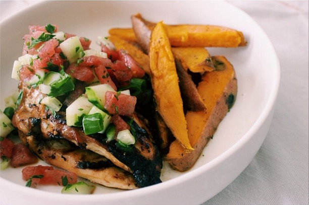 Marinated grilled chicken with cucumber-watermelon salsa and sweet potato fries. BOOM!